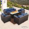 This outdoor couch set includes outdoor chairs, an outdoor sofa, an outdoor loveseat, and a gas fire pit table, providing a graceful, breezy style that complements any decor. The modular design allows you to create the perfect configuration to suit your space and style, making it adaptable for various decorative fashions and scenes.