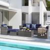 Designed to accommodate up to six people, this set includes 2 corner sofas, 2 single chairs, 1 armless single sofa, 1 ottoman, and a coffee table with a tempered glass top. Each piece comes with plush seat and back cushions, as well as 3 throw pillows, providing ultimate comfort for your outdoor gatherings. The cushions and pillows feature zippered 250g polyester covers that are easy to remove and clean, ensuring your set always looks its best.