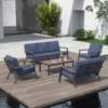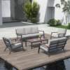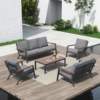 Elevate your patio with our 5-Piece Aluminum Patio Furniture Set, designed to combine modern aesthetics with nature-inspired elements. This versatile set includes a sectional sofa, loveseat, two armchairs, and a coffee table, making it perfect for any outdoor gathering. The sleek aluminum frame paired with FSC-certified eucalyptus wood armrests and tabletop creates a stunning and durable focal point for your outdoor living area.