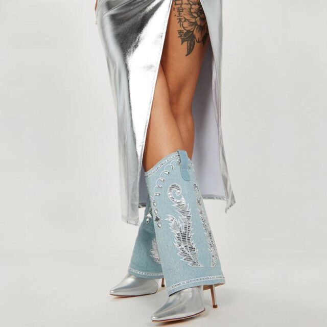 Transform your wardrobe with these exquisite Luxury Crystal Embroidered Denim Stiletto Boots. Perfect for the fashionista who loves to make a statement, these boots are a fusion of classic Western style and modern luxury. The super high heels elongate your legs, while the pointed toe adds a sleek and sophisticated touch. Whether you’re hitting the runway or just want to add some sparkle to your everyday look, these boots are your go-to choice.