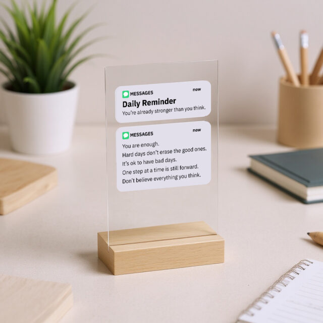 Bring positivity into your daily routine with the Daily Reminder Acrylic Sign with Wooden Stand. Designed to brighten your space and lift your mood, this elegant piece is more than just décor—it’s a gentle nudge to keep going, stay focused, and embrace the day ahead. Crafted with care, its clean, modern design makes it perfect for your home, office, or even as a thoughtful gift for someone who could use a boost of encouragement.