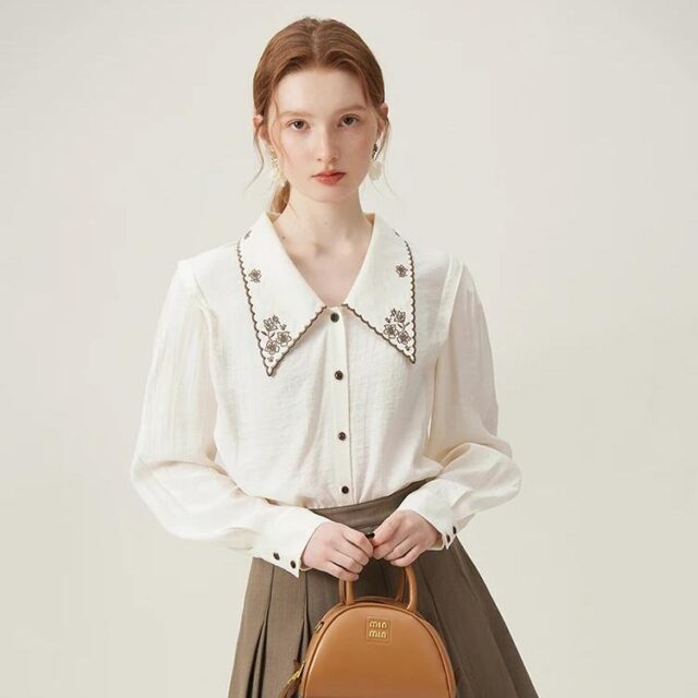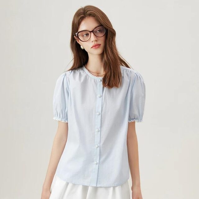 What makes this blouse truly special is its ability to blend classic elegance with modern style. The sailor collar adds a touch of nautical charm, while the puff sleeves bring a hint of femininity and grace. This blouse is not just a piece of clothing; it’s a statement of your refined taste and impeccable style.