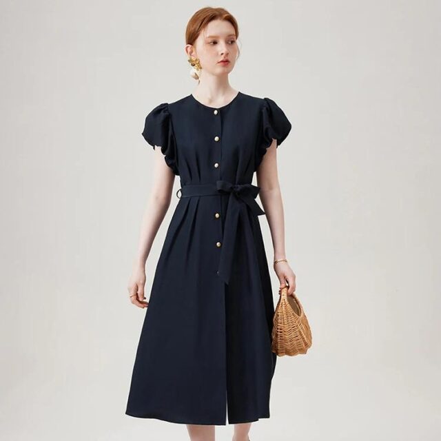 The natural fiber composition ensures breathability and comfort, keeping you cool even on the hottest summer days. The slight stretch in the fabric allows for easy movement, making it perfect for commuting and everyday wear. The empire waistline enhances your figure, creating a flattering look that exudes confidence and elegance.