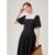 This midi dress stands out with its empire waistline and button decorations, adding a touch of charm and femininity. The mid-calf length and solid black color make it a versatile piece, perfect for office wear, casual outings, or even special events. The non-stretch jersey fabric ensures it maintains its shape while providing a soft and smooth texture against your skin.