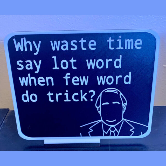 Bring some much-needed humor to your workday with this hilarious funny office sign featuring one of the best lines from Kevin Malone: “Why waste time say lot word when few word do trick?” If you love dry humor and smart simplicity, this minimalist sign is perfect for your desk. Whether at work or home, it reminds everyone that sometimes, less really is more. Show your love for classic TV moments while giving your space a playful and relatable touch with this funny office sign!