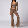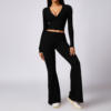 This set is perfect for those who want to look good and feel great during their workouts. The long sleeves provide the right amount of coverage, while the flared pants allow for easy movement. Whether you’re hitting the gym, practicing yoga, or engaging in outdoor activities, this set is designed to meet all your fitness needs.