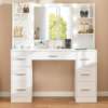 This large vanity desk with an LED-lighted mirror is the ultimate addition to your beauty routine. Measuring 15.7″ deep, 43.3″ wide, and 55.5″ high, this elegant white vanity table provides the perfect setup for your makeup and self-care essentials. The wide surface, combined with abundant storage, ensures everything is right where you need it. Plus, the built-in power outlet and USB ports keep your devices and beauty tools charged and ready, so you can focus on looking your best.