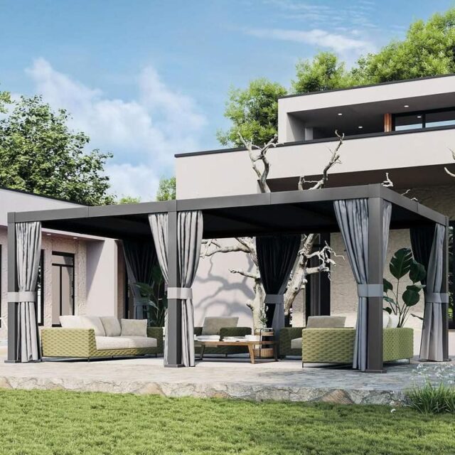 The adjustable louvered roof allows you to control the amount of sunlight or shade with ease. Whether you want to bask in the sun, shield yourself from a sudden rain shower, or simply enjoy a cool breeze, this pergola has you covered—literally! The roof’s adjustability, ranging from 0° to 75°, offers unparalleled flexibility, ensuring comfort in every season. Plus, with the included netting and curtains, you can create a private oasis that’s free from bugs and prying eyes, making it an ideal spot for both entertaining and relaxation.