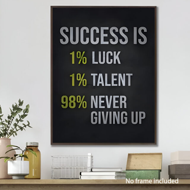 Infuse your home, office, or cafe with the power of perseverance and determination. Our motivational success quote wall art canvas features the powerful words: “Success is 1% luck, 1% talent, and 98% never giving up.” This unframed canvas print is the perfect piece to remind you every day that success is achieved through relentless effort. Whether you’re striving for personal goals, setting new milestones in your career, or simply need a daily dose of motivation, this canvas print inspires with every glance.