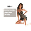 This stunning outfit features a sleek, black halter dress that elegantly hugs your curves. The backless design adds a touch of daring allure, while the fine glitter wrap-around skirt provides a shimmering finish that catches the light with every move. Included with the set is a matching G-string, ensuring a seamless and sexy look from head to toe.