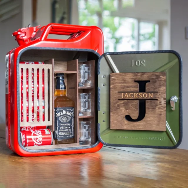 Looking for the ultimate portable mini bar gift? The Red Jerry Can Mini Bar is a show-stopping conversation piece that brings rugged charm and sophisticated style together in one unique package. Built from a real jerry can, this handmade fuel bar is transformed into an unforgettable whiskey mini bar, perfect for any man who loves adventure and good spirits. Whether you’re searching for a one-of-a-kind groomsmen gift idea, a memorable Christmas gift for dad, or a standout anniversary gift for husband, this liquor bar for him is ready to impress.