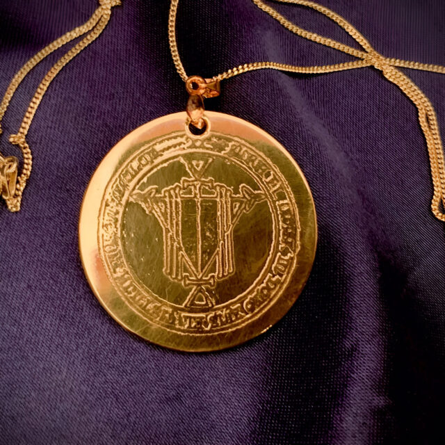 - 35mm diameter x 1mm thick virgin brass talisman with occult inscriptions