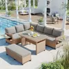 Crafted from premium all-weather PE rattan wicker and a durable galvanized steel frame, this sectional set is built to withstand the elements and provide long-lasting enjoyment. The set includes two loveseats with extendable side tables, one corner sofa, one long bench, and a spacious dining table, comfortably seating up to seven people. Whether you’re looking to create a cozy corner for intimate gatherings or a larger area for entertaining, this versatile set has you covered.