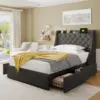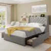 Introducing the perfect blend of functionality and style, the Twin Upholstered Bed Frame with Storage Drawers & USB Ports is a must-have addition to your home. Crafted with a sleek dark gray fabric, this bed frame effortlessly enhances any bedroom décor while offering impressive storage solutions and modern tech features. Whether you’re in a cozy apartment or a child’s room, this platform bed is designed to maximize space and keep everything organized.