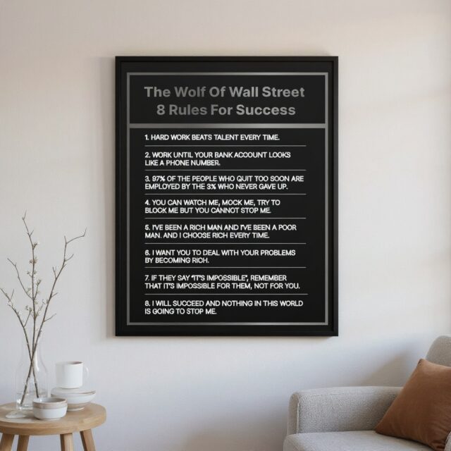 The Wall of Wallstreet Rules Poster is perfect for anyone who wants daily motivation to push harder, think bigger, and achieve more. It’s an ideal addition to workspaces, offices, study areas, gyms, or even as a bold centerpiece in your living room. Gift it to an entrepreneur, a student, or anyone chasing their dreams—it’s a reminder that ambition should always be on display.